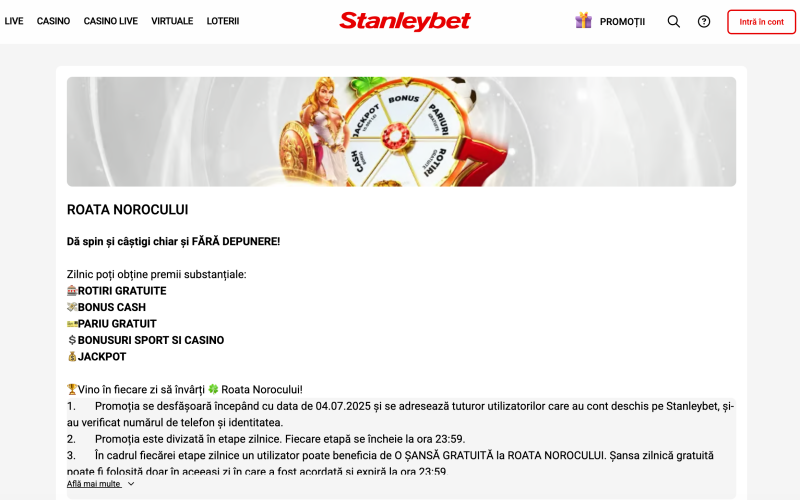 Poți alege să obțineți bonusul de bun venit în timpul primei depuneri. În anumite situații, trebuie să introduceți un cod promo Stanleybet în secțiunea dedicată sau să contactați suportul pentru a activa.