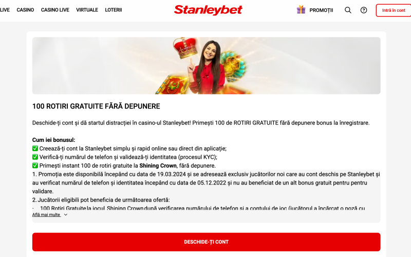 Promoțiile pentru a atrage clienții includ rotiri gratuite la înregistrare și un Stanleybet bonus fara depunere. De obicei, constă într-o serie de rotiri gratuite pe care le primiți imediat după finalizarea procesului de înregistrare și verificare a identității (KYC), fără a fi nevoie să depuneți în primul rând bani.