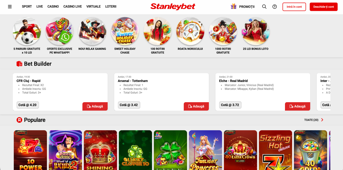Secțiunea de Stanleybet pariuri este cu siguranță punctul forte al operatorului. Pariorii români pot alege dintr-o varietate impresionantă de sporturi, de la fotbal, tenis și baschet până la sporturi mai mici sau sporturi virtuale. Piețele de pariere sunt foarte diverse, cu handicapuri asiatice, scor corect, număr de cornere și multe altele. Cotele sunt foarte competitive, mai ales la evenimente mari. Plasarea rapidă a biletelor în sistem, combo sau simplu este posibilă pe platformă. Fanii fotbalului vor aprecia în mod deosebit acoperirea oferită de ligile românești și competițiile europene de top.